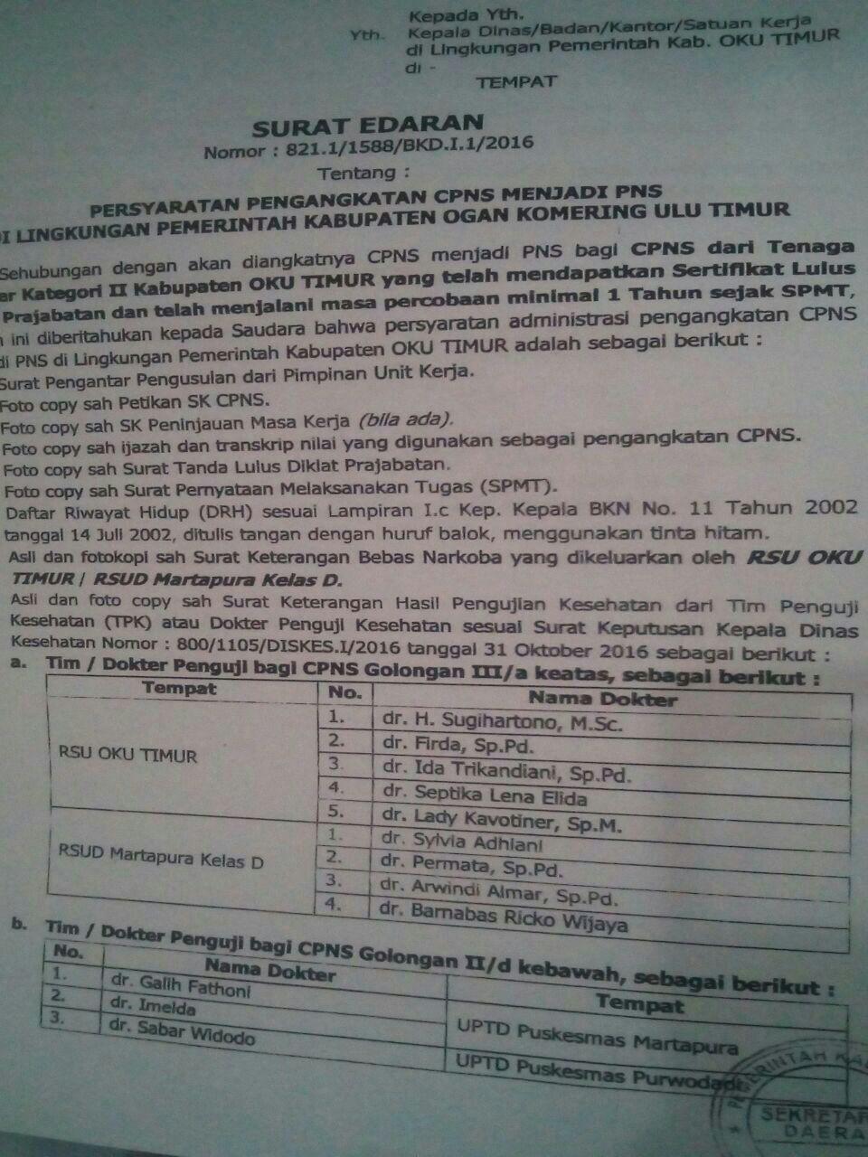 Sehubungan dengan akan diangkatnya CPNS menjadi PNS bagi CPNS dari tenaga Honorer kategori II Kabupeten OKU Timur yang telah mendapat sertifikat lulus dari diklat prajabatan dan telah menjalani masa percobaan 1 tahun sejak SPMT.