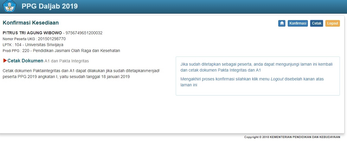 Nah, setelah adanya pengumuman LPTK tanggal 14 Januari 2019, setiap calon peserta (Mahasiswa PPG Dalam Jabatan) diharuskan melakukan Konfirmasi Kesediaan lalu mencetak Form A1, Berikut ini saya akan membagikan langkah-langkah melakukan konfirmasi kesediaan sekaligus mencetak form A1.